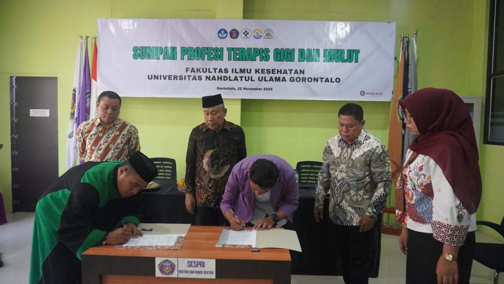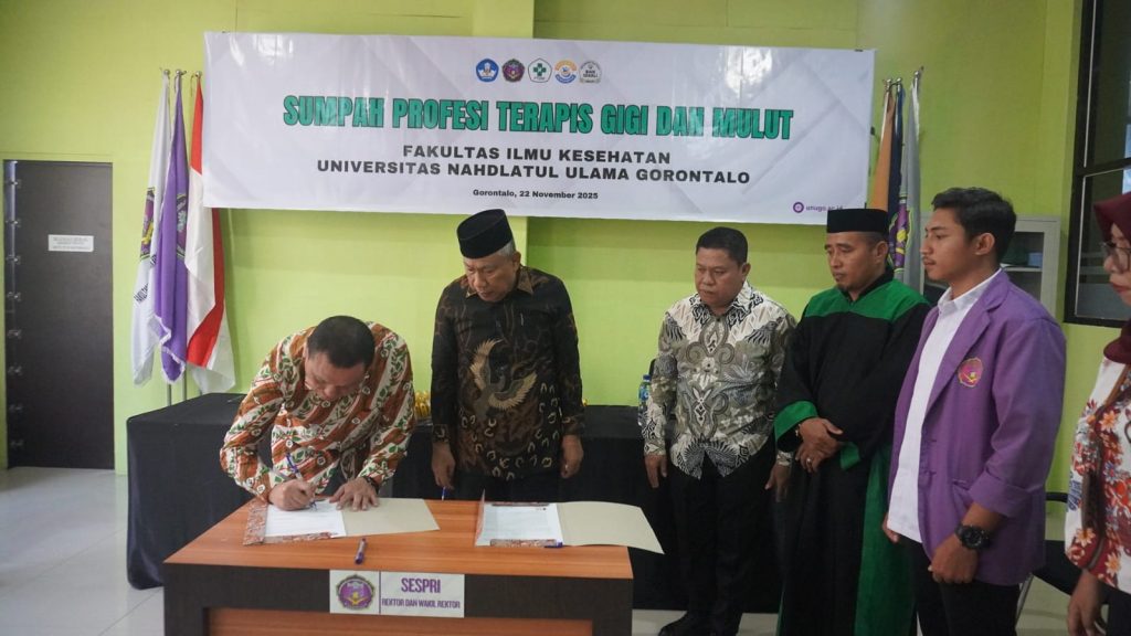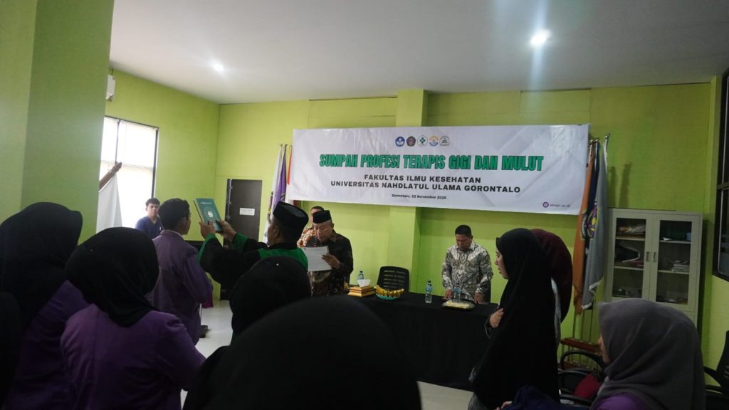 [unugo.ac.id] Gorontalo, 22 November 2025 – Fakultas Ilmu Kesehatan Universitas Nahdlatul Ulama Gorontalo (UNUGO) menyelenggarakan Acara Sumpah Profesi bagi mahasiswa Program Studi D4-Terapi Gigi. Kegiatan tersebut berlangsung di ruang Kampus 1 UNUGO dengan diikuti oleh 30 peserta yang disumpah profesi.