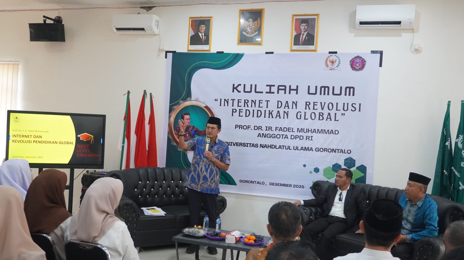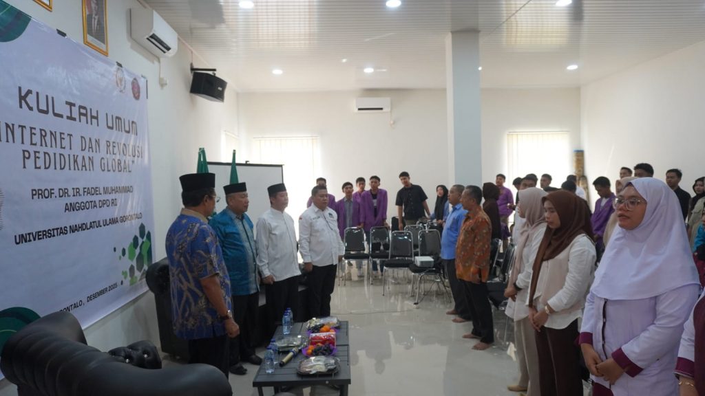 [unugo.ac.id] Kota Gorontalo – Kuliah Umum bertema “Internet dan Revolusi Pendidikan Global” yang dibawakan oleh Prof. Dr. Ir. Fadel Muhammad, Anggota DPD RI, menjadi momentum penting bagi Universitas Nahdlatul Ulama (UNU) Gorontalo untuk menegaskan komitmen menghadapi era transformasi digital di bidang pendidikan. Kegiatan ini diselenggarakan di aula PWNU Gorontalo pada Senin, 22 Desember 2025, dan dihadiri oleh civitas akademika UNU Gorontalo dari berbagai program studi dan unsur pimpinan universitas, fakultas dan program studi.
